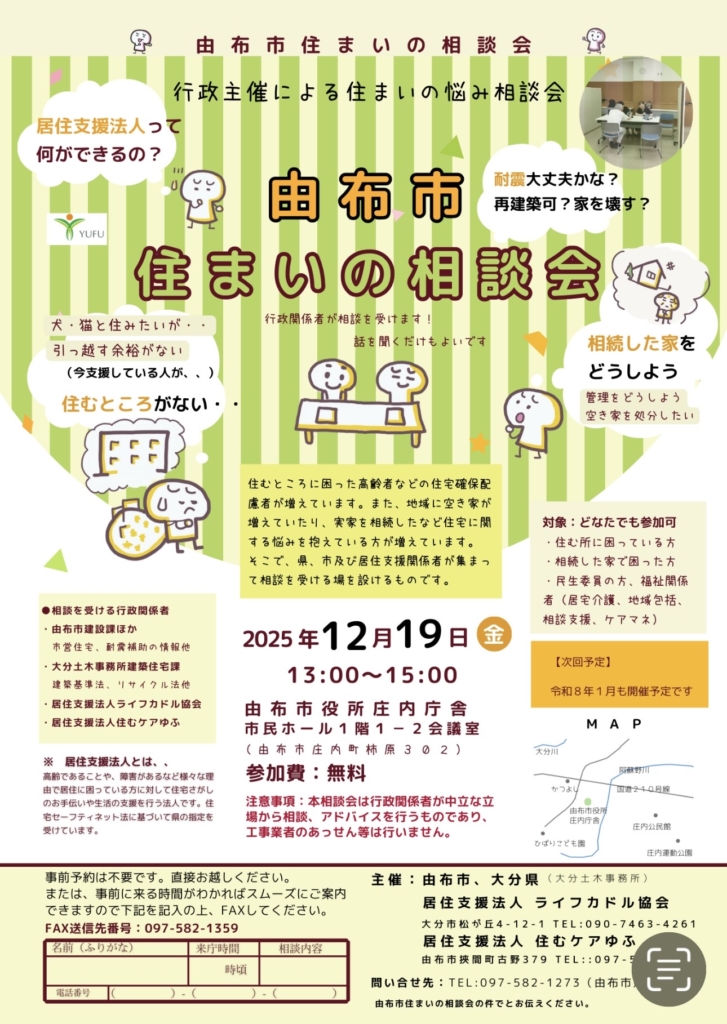 12月19日(金) 由布市住まいの悩み相談会お知らせ! 2025 12/10 お知らせ 2025.12.10 いつも一般社団法人ライフカドル協会の公式サイトをご覧下さり、ありがとうございます! お知らせ 居住支援サポート 9月19日(金) 居住支援セミナー&住まいの悩み相談会のお知らせ! 令和8年1月14日(水) 住まいの悩み相談会お知らせ!